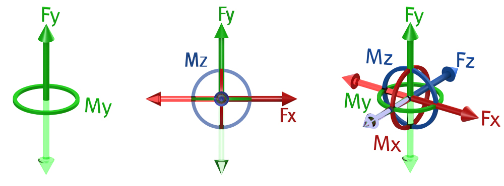 Das Drehmoment ist eine vektorielle Größe, die um alle Richtung einer im Raum ausgerichteten Achse des Raumes wirken kann. Mehrachsige Kraftaufnehmer bieten die Möglichkeit die X-, Y-, und Z-Komponenten und ggf. das jeweilige Drehmoment auszuwerten.